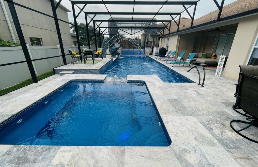 A family of four found their missing puzzle piece in creating their vision for their backyard pool oasis. The Tropic, a fiberglass pool with the Cabana spillover Spa attached was the ideal vision. With the help of our team, we broadened their knowledge on special features they would be able to add along the way. The couple highlighted what features they envisioned were most important. These features consisted of light features, water features, and plenty of decking area for entertainment. As we worked together, we set forth putting their vision into a work of art.